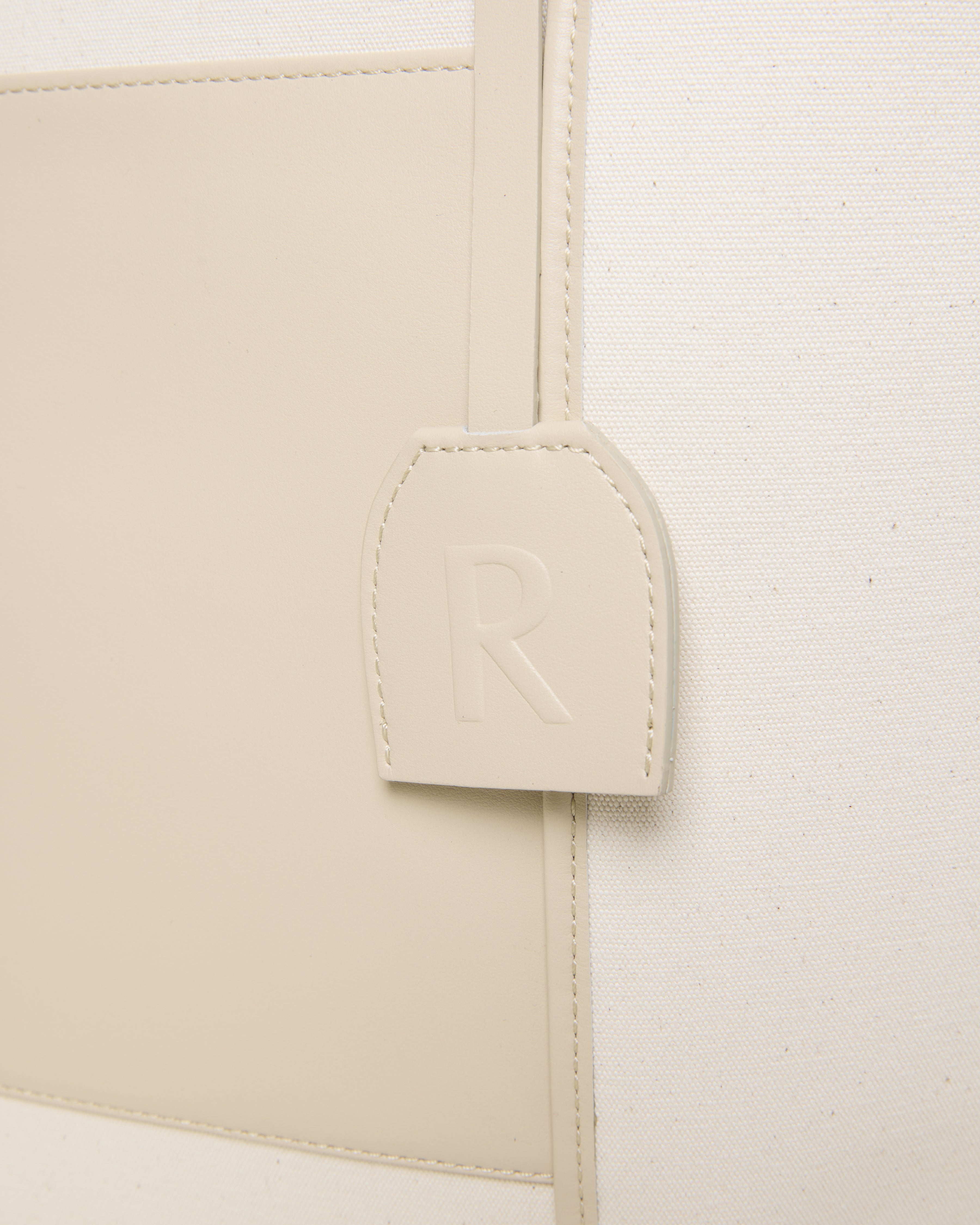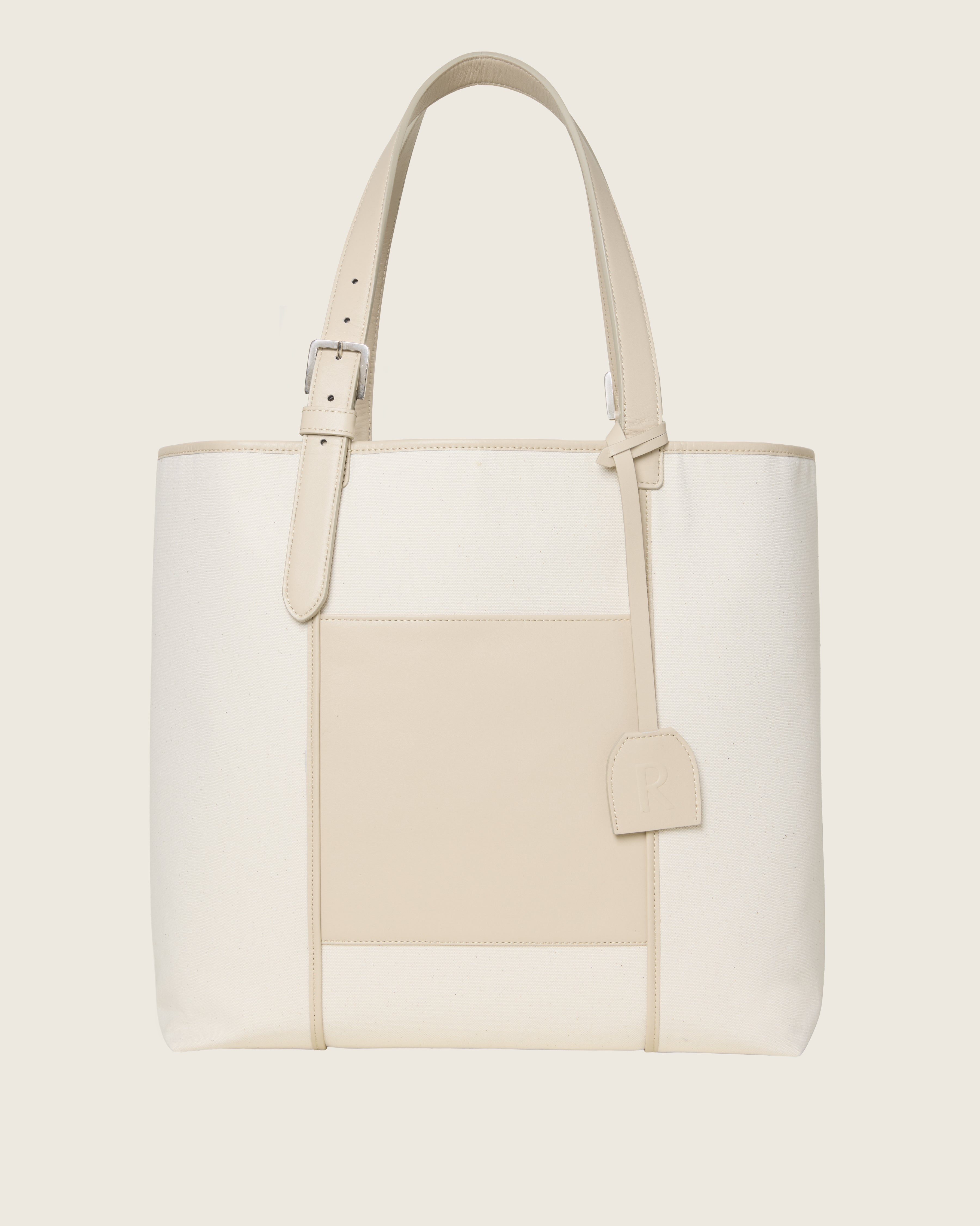 Convenient-sized shopper bag that combines form and function, designed to fit different needs. This item is made of canvas, matching leather details and a customized leather patch on the front with a hot-stamped logo.