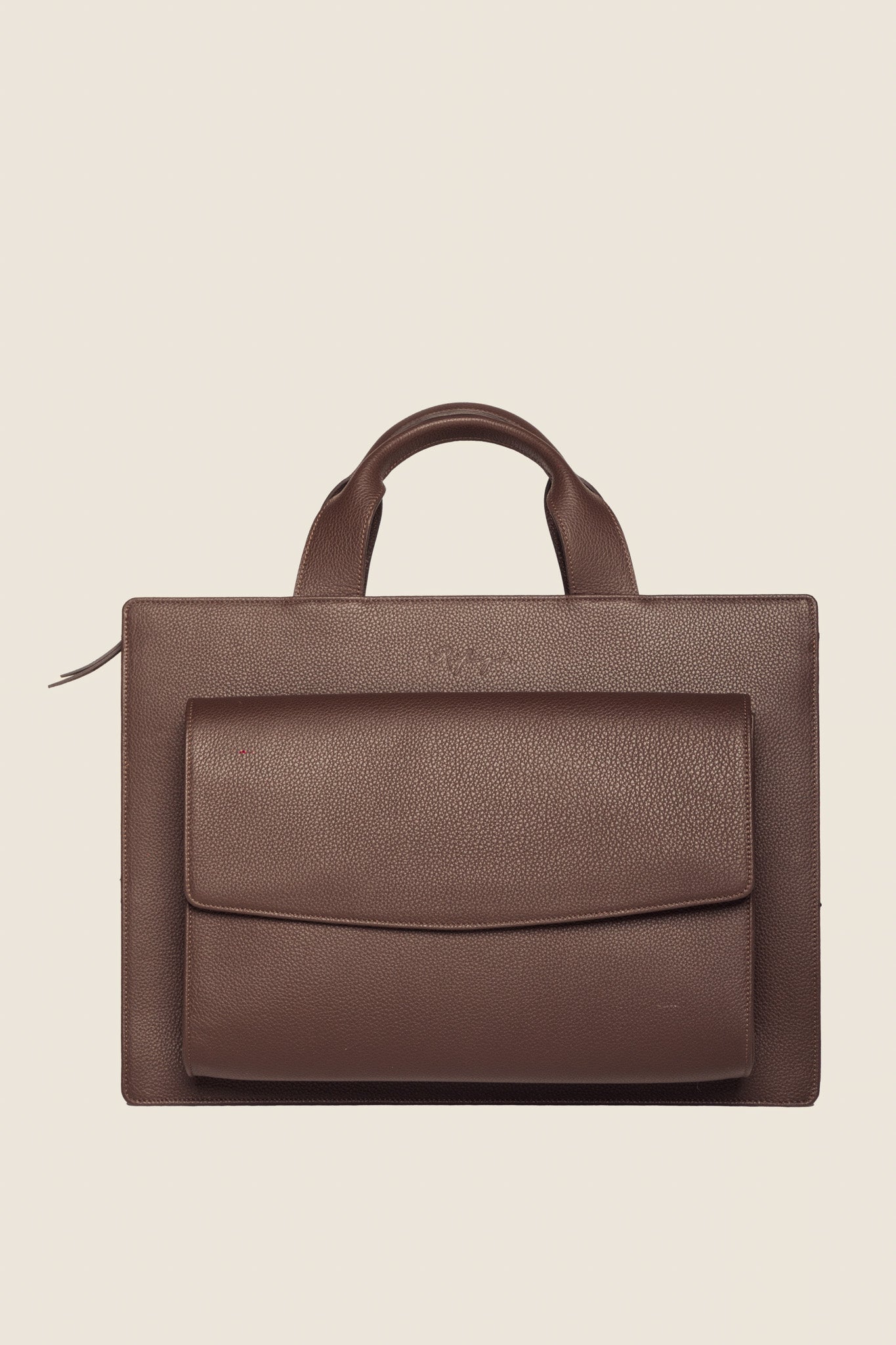 The Refined bag combines practicality and refinement, with its spacious design and soft calfskin leather evoking luxury.  Its external clutch,  allows for adaptable volume and versatility, while the soft calfskin trim and handles add a touch of luxurious sophistication.
